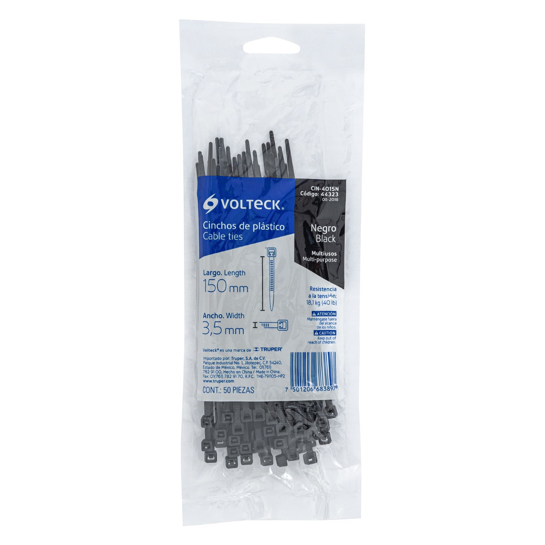 Bolsa con 50 cinchos plásticos 40 lb, 150×3.5 mm, negros 44323